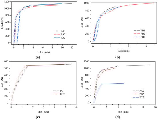 Load–slip curves of specimens. (a) PA specimens; (b) PB specimens; (c) PC specimens; (d) the comparison of PA2, PB2, and PC2.