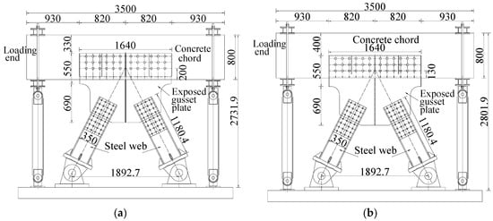 Strain gauges and rosettes were arranged on the concrete chord, gusset plates, and steel web members, as shown in Figure 8. Two LVDTs were set on the end-face of the concrete chord to measure axial displacement.