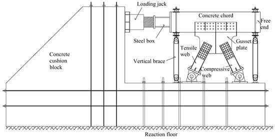 The experimental setup is shown in Figure 7. A monotonic loading mode was adopted. The axial load was applied by a hydraulic jack with a capacity of 6000 kN to the steel–concrete composite joint specimen. A prestressed concrete base was poured to constitute a self-balancing system and to resist the large force. The vertical brace was assembled to avoid unnecessary deflection along directions other than the loading direction. Otherwise, a welded steel box was utilized to transfer force from the jack to the concrete chord and to avert large local stress. The loading end of the concrete chord sustained a horizontal force applied by the loading jack. Then, the gusset plate transferred the force to the steel truss web.