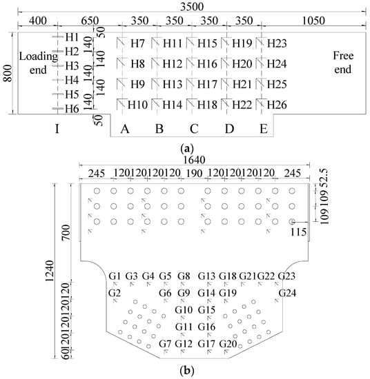 Arrangement of strain gauges and rosettes (unit: mm). (a) the concrete chord. (b) the gusset plate.