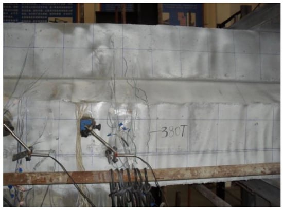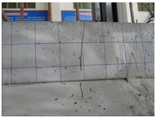 The experimental observations indicated that all three specimens had satisfactory bearing capacity and deformability. For the CJA specimen, the first crack appeared at the top of the core concrete near the loading end when the load reached 4000 kN. Moreover, the crack propagated downward along with the increase in load, as shown in Figure 9. No obvious failure occurred, but some cracks appeared before the loading program was complete. The behavior of CJB1 and CJB2 were similar to that of the CJA specimen. When the imposed load reached 3800 kN and 4200 kN, respectively, the first crack was found on the concrete chord. The initial crack of CJB1 is illustrated in Figure 10. In general, no severe damage was observed in any specimen throughout the whole loading procedure, and the crack was closed after unloading.