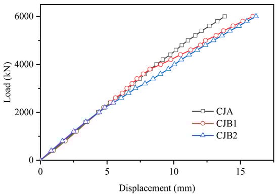 Figure 11 shows that the displacement was augmented linearly with the increase in load. The trends of the curves show that the load-to-displacement ratio of CJA was larger than that of CJB. No obvious turning point appeared in CJA and CJB2. Hence, the load–displacement curves of CJA and CJB2 were in the linear elastic stage. The slope of the curve decreased after 3800 kN in CJB1 on account of the initial crack observed at 3800 kN. The displacement values of the concrete chord were 13.83 mm, 15.94 mm, and 16.17 mm in CJA, CJB1, and CJB2, respectively, when the load procedure was finished. Obviously, the bearing capacities of CJA, CJB1, and CJB2 were higher than 6000 kN. Furthermore, the bearing capacity was at least 2.93 times the design load. Overall, almost all members were in the elastic stage and had not only good deformability but also great potential to carry a greater load.