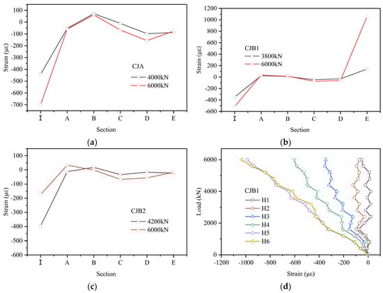 Load–strain curves of the concrete chord. (a) CJA; (b) CJB1; (c) CJB2; (d) the strain values of the first column strain gauge in CJB1.