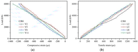 Load–strain curves of the steel web. (a) the compressive steel web of CJB1; (b) the tensile steel web of CJB1.