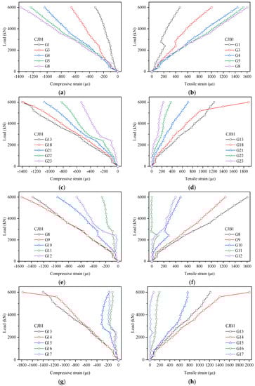 Load–strain curves of CJB1′s gusset plate. (a) compressive strain from G1 to G8; (b) tensile strain from G1 to G8; (c) compressive strain from G13 to G23; (d) tensile strain from G13 to G23; (e) compressive strain from G8 to G12; (f) tensile strain from G8 to G12; (g) compressive strain from G13 to G17; (h) tensile strain from G13 to G17.