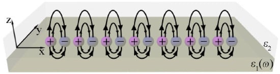 The surface plasmon is a collective oscillation caused by the free electrons in the metal surface under the action of an external electromagnetic field. According to the form of expression, surface plasmons can be divided into propagation-type surface plasmon polaritons (SPPs) and non-propagating localized surface plasmons (LSPs) [,]. In this paper, the basic principles of surface plasmons are characterized by taking SPPs as an example. LSPs are generated by the interaction between the electrons in the particles and the photons of the incident light when the light is incident on the metal nanoparticles. SPPs are electromagnetic waves propagating along a metal surface generated by the interaction of external photons with free electrons on the metal surface., thus satisfying Maxwell equations.