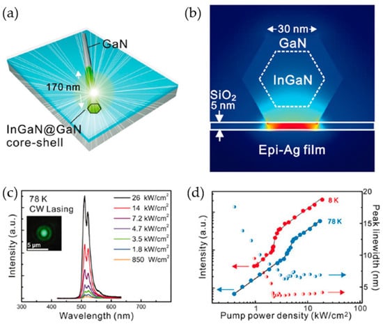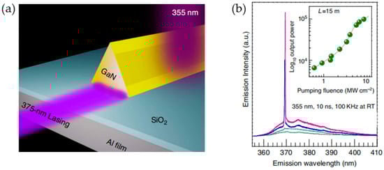 The internal ohmic loss of metal will increase sharply when the optical wavelength is close to the energy range of the inter-band/in-band conversion of metal materials, thus reducing the propagation length of surface plasmons. Therefore, the realization of plasmonic nanolasers in the ultraviolet band is still a difficult task. In 2014, Qing Zhang et al. reported a surface plasmon laser with a lasing wavelength of 370 nm at room temperature, which is pumped by a laser with wavelength of 355 nm, a pulse width 10 ns and a repetition rate of 100 kHz []. The threshold is 35 mJcm−2/3.5 MWcm−2. The low-threshold characteristics of this laser are primarily due to high-quality single crystal nanowires and good semiconductor–medium–metal contact. As shown in Figure 5, the device forms a semiconductor–dielectric–metal structure by placing GaN nanowires on Al and separating Al from GaN by SiO2. Al is used here because it has less loss in the ultraviolet band than silver. High quality GaN nanowires are the precondition of realizing low-threshold lasing. The nanowires are prepared by metal–organic chemical vapor deposition (MOCVD). The morphological characterization results show that the nanowires have a triangular cross section and smooth surface. The direct surface contact between the nanowire and the substrate reduces the scattering loss, which is more advantageous for the exciton to transfer energy to the surface plasmon, meaning that the gain generated by the GaN nanowire is fully utilized.