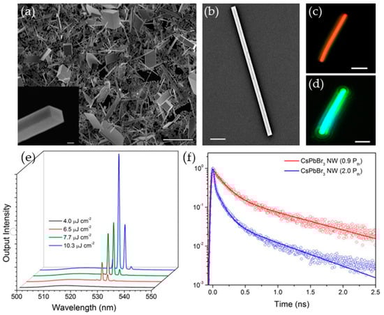 Applications of all-inorganic halide perovskite nanowires in laser field. (a) SEM (scanning electron microscope) images of CsPbBr3 nanowires and nanoplates, (b) a single CsPbBr3 nanowire isolated on a quartz substrate with a 5 nm Au sputter coat, (c) a dark-field photo of a single CsPbBr3 nanowire below the lasing threshold, (d) a dark-field photo of a single CsPbBr3 nanowire above the lasing threshold, (e) the power-dependent emission spectra of a single CsPbBr3 nanowire, and (f) the time-resolved fluorescent spectra of CsPbBr3 nanowires below (red) and above (blue) the lasing threshold [].