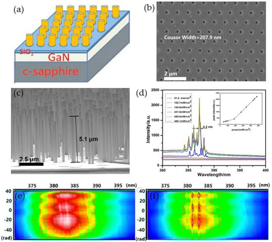 The structure is shown in Figure 8a. In this work, firstly, n-type ZnO nanowires (NWs) were fabricated on p-type GaN substrates by using chemical vapor deposition (CVD) and other subsequent microfabrication processes. The regular NW array has a length of about 5.1 μm and a diameter of 120 ± 10 nm. In order to obtain the regular array growth of NWs on the substrate, the growth positions of NWs are controlled in the regular hole array on the substrate, which is fabricated by electron beam lithography (EBL). Ag–dielectric hybrid nanofilms were sputtered on ZnO/GaN nanojunction arrays to excite surface plasmas at the interface of NWs and to ensure the limitation of plasma mode on nanolasers. Then, the laser behavior of the nano-heterojunction array device is experimentally demonstrated by the optical pumping method. The optical pumping threshold of the plasmonic nanolaser is about 184.9 mW/cm2. As shown in Figure 8d, all the peak modes are at the same wavelength (387.5 nm) at different pump power densities; that is to say, the excitation light comes from the same mode. However, due to the high pump power and the excitation of an adjacent NW which is slightly different in length, another mode begins to appear. Based on the highest peak mode of the measured spectrum, the quality factor of the fabricated device is 1937.5. Compared with other nanolasers confined by the mode of surface plasmon, it has a significant quality factor advantage. Laser beam point mapping experiments show that with the increase of pump power density, as shown in Figure 8e–f, the laser intensity gradually increases, the light gradually concentrates, and the laser beam is combined in an angle range of +30 degrees.
