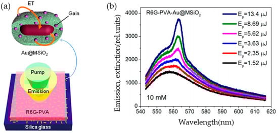 In 2009, Mikhail A. Noginov of Norfolk State University first successfully demonstrated LSP-based nano-lasers []. As shown in Figure 9, the nanolaser consists of an Au core, providing the plasmon mode, and silicon dioxide doped with OG-488 dye molecule providing gain. The diameter of the Au core is 14 nm, the thickness of the silicon dioxide layer is 15 nm, and the diameter of the whole device is only 44 nm. Because this single nanolaser has a small scale relative to the lasing wavelength, the radiation loss is very small. The loss of LSPs depends almost entirely on the absorption effect. It is pointed out that the laser characteristics are observed under the condition of high pump power. The lasing spectral bands of the plasma laser are 480  5 nm and 520  20 nm, respectively, at the pump power density of 0.98 MWcm−2 and 0.042 MWcm−2.