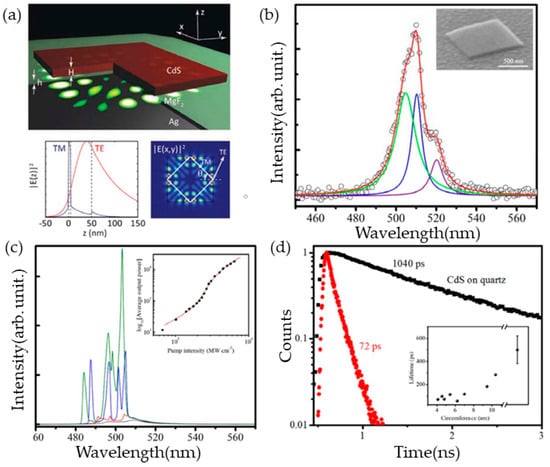 - Zhang, Q.; Li, G.; Liu, X.; Qian, F.; Li, Y.; Sum, T.C.; Lieber, C.M.; Xiong, Q. A room temperature low-threshold ultraviolet plasmonic nanolaser. Nat. Commun. 2014, 5, 4953. [Google Scholar] [CrossRef] [PubMed]