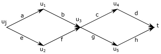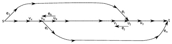 - For this backward section there must exist a path carrying some flow in the opposite direction, which the augmenting path p is canceling out. Indeed, as are edges in , they have been introduced in the residual graph thanks to the fact that the corresponding forward edges in E have already been used in a previously found path. Thus, if and , then S will already contain an item where the path , as the augmenting path p is crossing that section in the reverse direction, see Figure 2.