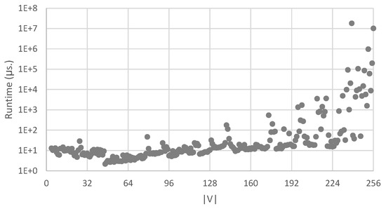 For our experiments with networks with up to 32 vertices and FSAs with up to 32 states, we found that running the brute-force algorithm either finished within a second, or did not finish even after 30 min, after which we always stopped the experiments. Careful investigation shows that the density of the network, combined with the structure of the FSA, is of prime importance to whether or not the algorithm finishes fast. For all the randomly generated experiments where the brute-force approach finished and provided us with the maximal value, the first lower bound also reached that same maximal value, but even in the worst observed cases in less than a millisecond, which is three orders of magnitude faster than the brute-force approach. The first lower bound algorithm could not find the maximal value only for specifically designed networks and FSAs, such as the network in Figure 3, aimed specifically at fooling the algorithm. For random experiments, the second lower bound algorithm always gives the same result as the first algorithm, taking only a little bit more time to execute. The third lower bound tries out much more combinations and comes closer to the brute-force approach in computational time, and in our random experiments always obtained the same maximal flow values as the second lower bound. We also executed random experiments with up to 256 vertices without having the maximal flow value, because the brute-force algorithm did not terminate. For the subset of these experiments where the three lower bound algorithms did terminate, also no differences were obtained in the resulting values. Thus, differences in the accuracy of results were never detected in any random experiment, and could only be obtained with specifically designed and contrived networks and automata. Runtimes for the first lower bound algorithm, for random networks having up to 256 vertices, are shown in Figure 4. If the algorithm finished, it typically finished fast (i.e., within about 10 s), as can be seen in the figure. If it didn’t finish, we aborted the execution after 30 min (not depicted).
