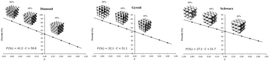 TPU/GE composite powder was used in the SLS printing process in order to build three porous structures by using Schwarz, Diamond, and Gyroid unit cells. Moreover, an accurate study to understand the correlation between the offset factor (C) present in the Equations (1)–(3), and the structure porosity of the structure is reported in Figure 1. The porosity linearly decreases by increasing the offset value, and this enables design of structures in a range of porosities (from 40% to 80%).