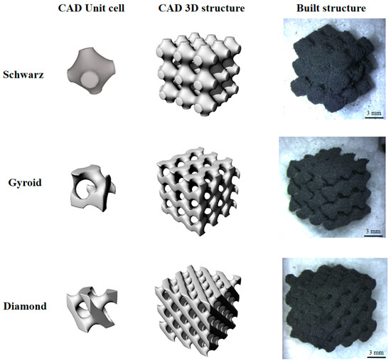 To design 3D porous structures, a mathematical approach has been used, starting from triply periodic minimal surface (TPMS) equations. TPMS are minimal surfaces periodic in three independent directions, extending infinitely, and in the absence of self-intersections, partitioning the space into two labyrinths. Wolfram Mathematica software was used to generate CAD-files that describe the surfaces of Gyroid (G), Diamond (D), and Schwarz (S) architectures at different porosity. The following trigonometric equations were used with boundary condition x, y, z = [−3π; 3π]: