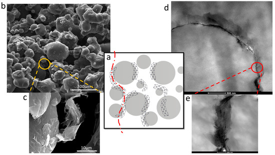 (a) Schematics of the microstructure of the fabricated porous TPU/GE composites (GE content 1.0 wt%), highlighting the percolated GE network at the interparticle boundary (red dashed line). SEM images of the (b) wall structure of the composite, and the (c) GE-wrapped TPU particle surface. (d,e) TEM images of the percolated GE network in the SLS-processed composites.