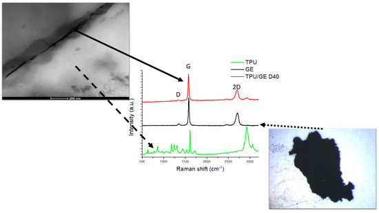 Raman spectra of GE powder (black line), and TPU (green line) and GE (red line) in the TPU/GE G40 composite after SLS processing.