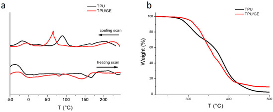 Thermal properties of TPU and TPU/GE were measured by differential scanning calorimetry (DSC) and thermogravimetric analysis (TGA). The DSC measurements were performed with a TA Instrument DSC Q2000. Samples of 5 mg were heated up to 250 °C at a heating rate of 10 °C/min, then cooled to −50 °C at 10 °C/min and reheated to 250 °C at 10 °C/min under nitrogen atmosphere.
