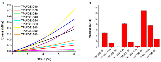The effect of porosity and geometry on the mechanical behavior of the TPU/GE porous structures was investigated by compression tests. Figure 6a shows the stress-strain curves for all investigated samples. An initial toe region caused by a take-up of slack and alignment of the specimen followed by a linear region can be observed. Elastic modulus was calculated from the linear region of the curves for all the geometries considered (Figure 6b). In particular, the samples were tested at small strain values (<10%), in order to ensure that all samples were in their elastic deformation region. D and G architecture structures show, in the deformation range which has been investigated, a linear increase of stress with increasing strain, while the S geometry structures exhibit a progressive strengthening during compression, which results in higher stress values in comparison to the corresponding D and G structures.