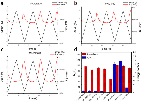 This outcome arises from the compactness of TPU particles and the enhancement of the GE nanoplatelet contact upon compression, which leads to the formation of more conductive pathways [46]. Electrical conductivity strongly depends on the percentage of porosity but also on internal architectures of the 3D structures, both at low (i.e., zero deformation corresponding to the case of constant preload applied to the samples) and high deformation (i.e., 8% deformation in compression). In detail, the conductivity at zero deformation decreases as the percentage of porosity increases. In fact, considering the S geometry, σ decreased by about one order of magnitude when the porosity increased from 40% to 80%, going from 1.17 × 10−5 to 1.50 × 10−6. Similar results have been obtained when the deformation is 8%. Moreover, the piezoelectrical sensitivity varies significantly with the three geometries, as it is possible to see from the ratio of electrical resistance (R0/R8), whose values are reported in Table 2.