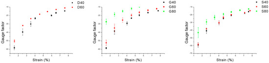 In particular, for the systems with G geometry, the R0/R8 values changed from 2.21 ± 0.20, and in the case of the G80 structure, to 4.95 ± 0.50 for the less porous G40. More significantly, the systems with S geometry showed larger resistance variations with a one-order of magnitude drop when S40 structure is compared with S80 structure (Figure 7c,d). The compression sensitivity of several porous structures was evaluated by measuring the gauge factor (GF) at 8% strain (Figure 7d). All samples displayed GF absolute values above 6, with TPU/GE S40 and TPU/GE S60 displaying a value above 12. This difference is ascribed to the peculiar shape of the S unit cell, which leads to 3D structures with bigger trabeculae, which under deformation give rise to the building up of more effective conductive pathways. To the best of our knowledge, such high values have never been reported for graphene-based polymer porous structures when subjected to compressive strain [47]. It has to be pointed out that GF values are even higher for deformation extents lower than 8%, and then tend to plateau as the maximum strain value is approached (Figure 8). Indeed, most samples displayed GF absolute values ranging from 60 to 20 for deformation extents from 1% to 5%.
