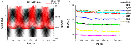 (a) Piezoresistive behavior of TPU/GE S40 over 50-cycle compression test, and (b) resistance values at 8% strain as a function of time for all TPU/GE composite structures.