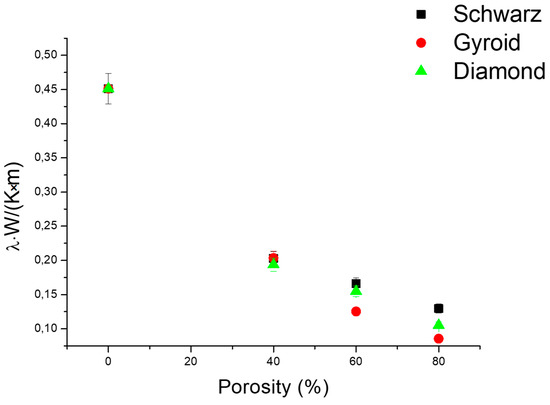Obviously, λ decreases as the porosity increases, going from 0.451 ± 0.023 W/m·K for the bulk material down to 0.086 ± 0.004 W/m·K for the Gyroid structure with 80% porosity. It was ascertained that an increase in porosity is linked to a decrease in the trabeculae size and an increase of pore dimension for a given unit cell [48]. On the other hand, results obtained for the three different architectures (D, G, and S) indicate that the effect of geometry on the thermal conductivity is small if compared with the effect on the electrical properties and piezoresistivity. This confirms that the transfer of heat phonons and electrons are subject to different physical laws. However, the thermal conductivity remained similar for the different geometries until 40% of porosity. Above this value, the Schwarz geometry showed the highest λ values, while the Gyroid displayed the lowest values, both at 60 and 80% porosity. This effect is again ascribed to the different size of trabeculae generated by the D, G, and S unit cell architectures.