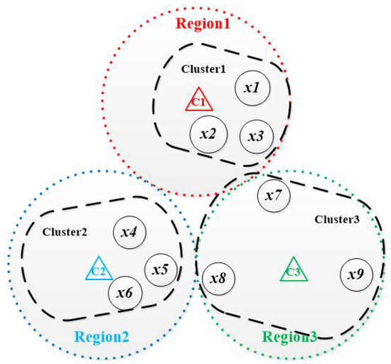 As shown in Figure 1a, it is assumed that all feasible solutions are distributed in three regions: region 1, region 2 and region 3. Suppose there are nine randomly generated individuals, where are distributed in region 1, are distributed in region 2, are distributed in region 3, and are the three best individuals in the population. When clustering begins, based on the k-means algorithm, the clustering result is shown in Figure 1b where the cluster 1 includes , the cluster 2 includes and the cluster 3 includes . Since are the best solutions in their own clusters, they will be set as the centers after clustering. Then the individuals begin to update. According to the updating rules, the search direction of individuals will be guided by the cluster centers. In this case, as shown in Figure 1b, the existing individuals will move towards the position of which will cause most of the individuals gather to region 3 and the global searching cannot be performed. So the algorithm is easy to fall into local optimum.