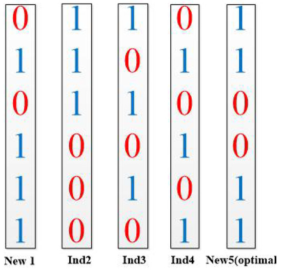 It can be seen from Algorithm 3, in one iteration, the improved updating strategy does not update all individuals in the population, it only updates two individuals in each cluster(the best individual and a randomly selected individuals in the cluster), which will reduce the running time of one iteration. The updating of the optimal individual uses the method of adding random information to it. It is advantageous to the optimal individual to jump from the local region. The updating of the randomly selected individual uses the method of moving random length towards the optimal individual, which not only guarantees the difference between the randomly selected individual and the optimal individual, but also helps the randomly selected individual effectively search for better individuals. In addition, some individuals will be updated by the randomly generated individuals, which will better keep the population diversity. Based on the improved updating strategy, individuals in Figure 2a will be updated to new individuals as show in Figure 4. Where the 5th individual is the optimal individual and the first individual is the randomly selected individual.