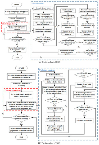 With the improved clustering method and updating strategy, IBSO can successfully avoid the premature convergence and achieve a higher efficiency. The flow charts of BSO and IBSO are shown in Figure 5.
