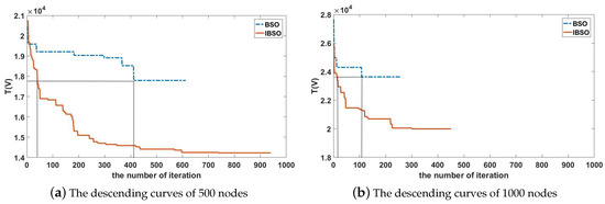 On the other hand, it can be seen from the descending curves, getting the solutions of the same quality, the IBSO requires fewer iterations than the BSO. For example, in Figure 6a, the quality of solution obtained by the BSO with 410 iterations is the same as that of the IBSO with 40 iterations. In addition, the running time of one iteration of the IBSO is shorter than that of the BSO. Because the IBSO only updates two individuals in each cluster while the BSO updates all individuals in the population. Therefore, the IBSO is more efficient than the BSO. Based on the comparison between BSO and IBSO, we can draw the conclusion that the IBSO algorithm has overcome the shortcoming of premature convergence and improved the algorithm efficiency.