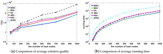 It can be seen from Figure 7a that the of the IBSO algorithm is the minimum, which means that the IBSO algorithm can get the solution with the best quality among the six algorithms. The solution quality of the AFSA is approximate to that of the IBSO. The solution quality of the BSO is approximate to the solution quality of the GA and the PSO, but they are inferior to the IBSO. It can be seen from Figure 7b that the IBSO has the shortest running time. The BSO is approximate to the IBSO. The AFSA had the longest running time. From the two aspects of the solution quality and the running time, we can draw the conclusion that the IBSO performs best.