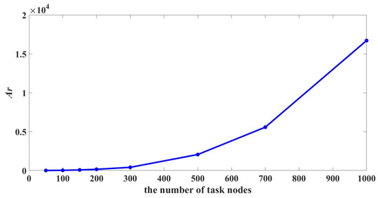 As the number of subtask nodes increases, the hardware/software partitioning problem will be more and more complex. To analyze the performance of IBSO when applied to tasks of different scales, IBSO is applied to solve the eight benchmarks. For each benchmark, the algorithm was run 20 times, and in each run, the algorithm is terminated after 2000 iterations. For each benchmark, the average running time Ar of the 20 runs is calculated. The values of Ar of the eight benchmarks are shown in Figure 8.