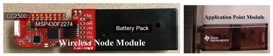 In this WSN system, there are two main physical components: a wireless node module and an application point module. The wireless node module consists of an EZ430-RF2500 board, which is developed by Texas Instruments Inc. (Dallas, TX, United States). As shown in Figure 1, this board integrates an MSP430 microcontroller from Texas Instruments Inc. (Dallas, TX, United States), a CC2500 antenna chip from Texas Instruments Inc. (Dallas, TX, United States), and several signal input/output (I/O) pins for connecting heterogeneous environmental sensors. The board is powered by a battery pack that provides a supply voltage of 3 V. The application point module differs from the wireless node module in that it is powered by a USB port that provides a direct physical link to a computer.