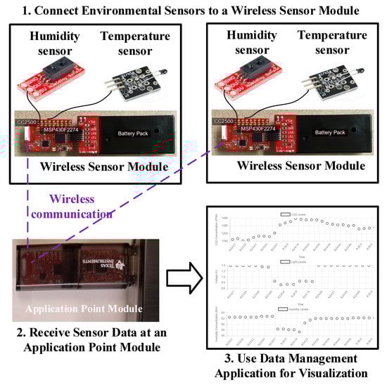 This proposed software framework provides an abstraction level for low-level microcontrollers in the network to collect data for users. With the Data-Management-Application module, users can easily modify collected data into forms that can be easily used with any other existing application. As shown in Figure 3, the system operation and the life cycle of acquired data are described as follows: (1) The output pins of environmental sensors (e.g., humidity and temperature sensors) are connected to the user I/O pins of wireless node module. Yet, each environmental sensor provides its analog output, referring to the supply voltage and ground voltage of the sensor node. Therefore, when an analog output is captured by a wireless node module, it is necessary to convert the analog output to an appropriate voltage with respect to the reference voltages of a wireless node module. In the proposed software framework, all sensor output pin voltages, device temperature, and device voltage sets are packaged in a Simple-Device object. Then, this object is compressed into a Simple-Message object, which is wrapped into a SimpliciTi API package. (2) This package is wirelessly transmitted to an application point module, which decompresses a Simple-Message object back into a Simple-Device object. Then, a Simple-Communication object is used to send received environmental sensor data to a host computer in JSON format via the UART port. On the host computer, an Application-Point-Server host listens for any incoming transmission on this specified UART port. Once a Simple-Communication event is detected, the received data is modified based on the user specifications defined in the Data-Management-Application. For example, when an application point module sends data serially to an Application-Point-Server host, the data can be converted from “devicePin3Voltage: 2.33” to “CO2 (ppm): 1200”. This conversion is achieved by mapping the received data to specified user data. (3) After the host computer obtains the captured sensor data, it will upload the data to an online database for visualization or analysis in the future. According to the above discussion, the proposed system supports a “Plug and Play” style of system operation and data acquisition. Once a user connects the output pin of an environmental sensor to a wireless sensor module, the specific sensor data will be captured and converted via the proposed software framework, and then the data collected by this environmental sensor will be uploaded to an online database. The disconnection of an environmental sensor from this WSN does not affect the operation of other sensors in this system.