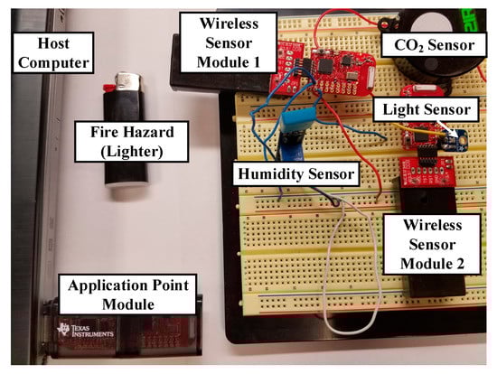 In the literature, a variety of WSN systems have been widely adopted in fire hazard detection and prediction [,,,,]. Therefore, in this work, in order to validate the functionality of our proposed software framework, we applied our developed WSN system to detect indoor fire hazards in an office building.