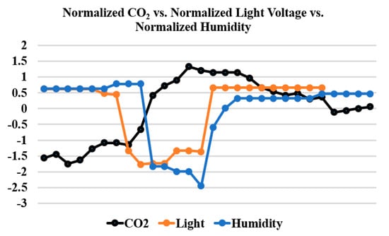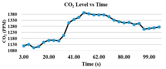 As shown in Figure 4, the experimental setup consists of two wireless sensor modules, an application point module, a host computer, a fire source (i.e., lighter), and three environmental sensors (i.e., a light sensor, a CO2 sensor, and a humidity sensor). The CO2 and humidity sensors are connected to wireless sensor module 1, while the light sensor is connected to wireless sensor module 2. After initializing the proposed WSN system to collect data for approximately 25 s, the lighter was ignited to produce a flame in this room close to both wireless sensor modules. Then, after keeping it for around 25 s, the lighter flame was extinguished. Figure 5, Figure 6, Figure 7 and Figure 8 plot how the collected sensor data in our deployed heterogeneous WSN system vary with time.