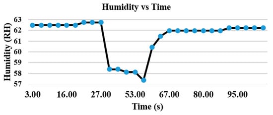 Figure 5 shows a sharp rise in the carbon dioxide level after the ignition of the lighter. We can see that the CO2 level gradually reached a peak value of 1380 ppm. After extinguishing the lighter, the flame disappeared, so the CO2 level began to drop slowly with time. In addition, as shown in Figure 6, the output voltage of this light sensor exhibited a valley value during the presence of the flame. An almost immediate voltage drop appeared at around T = 25 s, and a corresponding voltage rise appeared at around T = 55 s. Figure 7 plots the relative humidity (RH) values sensed by the humidity sensor in Figure 4. We can see that the RH level dropped sharply at around T = 26 s, and started to recover at around T = 55 s. The RH level is expected to be higher during the presence of a nearby flame because the byproducts of a combustion event are carbon dioxide and water. However, since the adopted RH sensor does take temperature into account when determining the RH value, the temperature increase caused by the flame adversely affected the sensor output. As a result, the measured RH value became even lower in this experiment.