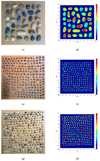 Typical particles and the corresponding 3-D scanning test results: (a) 13.2 mm crushed stone (CS); (b) test result of 13.2 mm CS; (c) 13.2 mm gravel (G); (d) test result of 13.2 mm G; (e) 2.36 mm CS; (f) test result of 2.36 mm CS; (g) 2.36 mm G; (h) test result of 2.36 mm G.