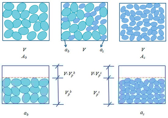 The packing state of each size particle in the TSP test is complex. Some indicators are defined for further understanding the packing characteristics. Denote Ab to represent the bigger size particles packing the volume V alone. Denote As as the smaller size particles packing V alone under the same packing method. Take a two-size combination with a given mass ratio to pack V under the same packing method, and record the bigger particles and the smaller particles in V as ab and as, respectively. Denote the packing volume of ab and as under the same packing method as Vpb and Vps, respectively. Figure 3 could be helpful to understand the meanings of the above mentioned symbols. The percentage of the packing volume of ab in V for the packed two-size combination can be defined as