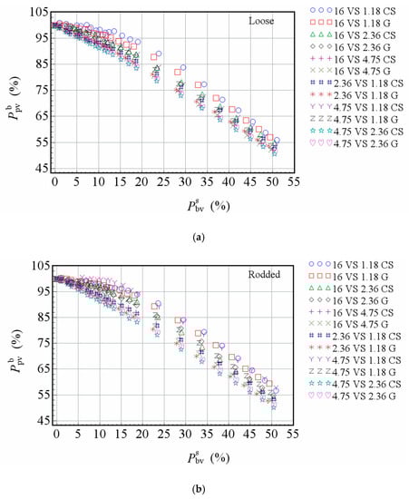 Relationships between Ppvb and Pbvs in two-size packing (TSP) tests: (a) Loose filling test; (b) Dry-rodded test.