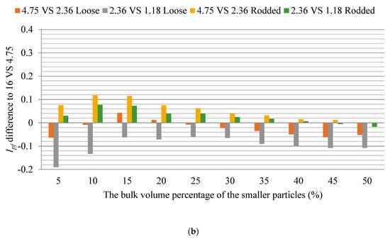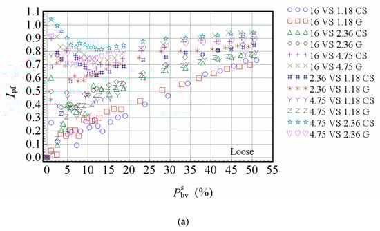 From Figure 9, it can be found that the Ipf of smaller particles is significantly different in the combinations with different maximum particle sizes. In the crushed stone dry-rodded test, compared with the 16 VS 4.75 combination, all Ipf values of smaller size particles in 4.75 VS 2.36 combination are 0.1 larger, and it is even 0.39 lager when Pbvs is 5%. Even for the combinations of 4.75 VS 2.36 and 2.36 VS 1.18, for which the size ratio is exactly same, there is a significant difference between the values of Ipf of smaller size particles. Comparing Figure 8a with Figure 8b, the packing behavior difference between crushed stone and gravel mixture can be understood. For the 4.75 VS 2.36 combination, whether the loose or dry-rodded packing test, the Ipf difference of smaller size particles to 16 VS 4.75 combination for the crushed stone blend is more significant than that of gravel, while that of 2.36 VS 1.18 combination is just the opposite. In addition, with the increase of the proportion of smaller size particles in the blend, the effect of size on packing function decreases gradually.