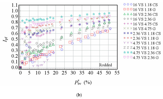 Relationships between Ipf and Pbvs in TSP tests: (a) Loose filling test; (b) Dry-rodded test.