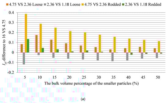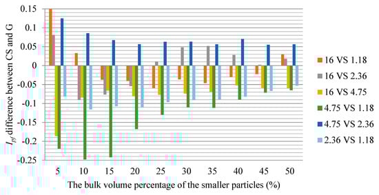 In order to analyze the effect of particle size on the packing behavior of blends with two-size particles, the combinations of 16 VS 4.75, 4.75 VS 2.36 and 2.36 VS 1.18 with equal particle size ratio are selected for comparisons. Figure 9 presents the differences in Ipf between 4.75 VS 2.36, 2.36 VS 1.18, and 16 VS 4.75 for different Pbvs. Figure 10 depicts the difference of Va between 4.75 VS 2.36, 2.36 VS 1.18, and 16 VS 4.75 for different Pbvs.