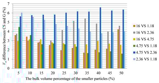 The and of each combination for the dry-rodded test are depicted in Figure 7 and Figure 8, respectively. As shown in Figure 7, the morphology of particles has a significant effect on the Ipf of smaller particles in the combination. However, the effects on different combinations are different. In the six combinations shown in the figure, the of 16 VS 4.75, 4.75 VS 1.18, and 2.36 VS 1.18 all have negative values, indicating that the Ipf of gravel particles in the mixture is larger than that of crushed stone. For the same combination, the contribution to the packing volume of smaller gravel particles is bigger than that of smaller crushed stone particle. For 4.75 VS 2.36 combination, the values of are all positive, indicating that in this combination, the Ipf of smaller gravel particles is smaller than that of smaller crushed stone particles, and the packing volume contribution of gravel particles with smaller size is smaller than that of crushed stone particles. For the combinations of 16 VS 2.36 and 16 VS 1.18, the value of is positive when the proportion of smaller size particles are small. With the increase of the proportion of smaller size particles, the value of becomes negative first and then become positive. The influence of morphology is more complex. It should also be noted that with the increase of the proportion of smaller size particles, the influence of morphology on the Ipf of particles tends to decrease gradually. As can be seen from Figure 8, the effect of particle morphology on Va is very significant. For all combinations, the Va of the crushed stone mixture is significantly higher than that of the gravel mixture. The minimum is 1.59, which corresponds to 50% of Pbvs in 4.75 VS 1.18 combination. The maximum is 6.61, which corresponds to 40% of Pbvs in 4.75 VS 2.36 combination.