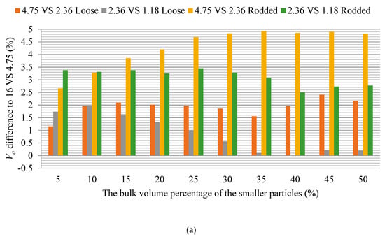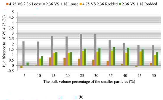 Figure 10 shows that the Va values of 4.75 VS 2.36 and 2.36 VS 1.18 combinations are higher than those of 16 VS 4.75 combination in almost all test cases, and there are significant differences between the combinations of 4.75 VS 2.36 and 2.36 VS 1.18. Among crushed stone dry-rodded test, the difference between 4.75 VS 2.36 and 16 VS 4.75 is the most prominent. Except for the difference of 2.66% when the Pbvs is 5%, the differences at other Pbvs are more than 3%, and most of them are more than 4%, where the maximum is 4.93%. Compared Figure 10a with Figure 10b, it can be found that the differences of Va for gravel mixtures are smaller than those for crushed stone mixtures except for the combination of 2.36 VS 1.18.