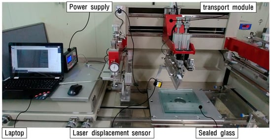 To derive the minimal step height, five basic experiments were carried out with different step heights. In each experiment, the sealed glass was divided into four sections vertically and horizontally, resulting in 16 separate subsections. To measure the height of the separate regions, a laser displacement sensor (CD-33-30N-422; Optex, Ogoto, Japan) was used. Figure 4 shows the layout of the step height measuring system. Figure 5 shows the schematics of the step height measurement.