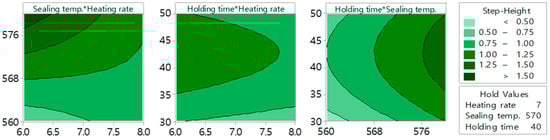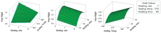 Figure 7 and Figure 8 show the contour and surface plots of the step height based on the process variables. The step height showed a curvature effect depending on the holding time. It was also found that the step height of the sealed edge was less affected by the heating rate, and that the step height was proportional to the temperature of the sealed edge.