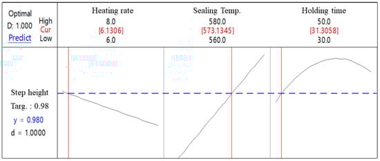 To satisfy the minimal step height of 0.98 mm, as previously determined in the basic experiment, optimal fabrication conditions were derived using response-optimization tools. The optimal values of the heating rate, sealing temperature, and holding time were found to be 6.13 °C/min, 573.13 °C, and 31.30 min, respectively. Figure 9 shows the graph of the optimized response, which was used to predict the step height of the sealed edge based on the process variables.