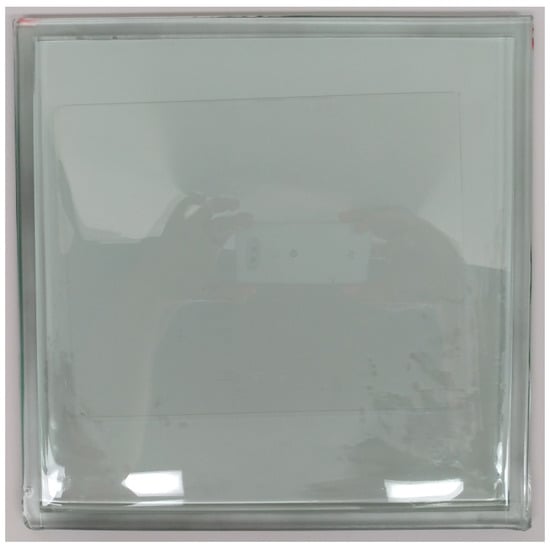 The microwave chamber for glass edge sealing was designed and constructed based on the electromagnetic wave distribution analysis using the HFSS program by ANSYS []. This experiment used the waveguide model WR-340 with a frequency range of 2.20–3.30 GHz, a voltage standing wave ratio of 1.25:1, and physical dimensions of 86.36 × 43.18 mm. The magnetron for microwave emission comprised six power sources with an output of 1 kW. The dimensions of the heating chamber were 400 (w) × 400 (d) × 192 (h) mm. Figure 1 shows the layout of the microwave chamber.